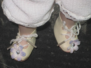 Покрутив собранного кукеля, пошла в запасники подбирать материалы на одежку. Шить решила панталоны, блузку и юбку. В бело-зеленой гамме с легким добавлением светло-лилового. Зеленый будет в клетку (люблю клетку!), лиловый - в цветах и лентах, а белый с одноименными кружевами. Туфли оставила "родные", попутно их все заново переклеив, т.к. они разваливались на части. Сделала дополнительную шнуровку и украсила носы лиловыми цветами со стразами: